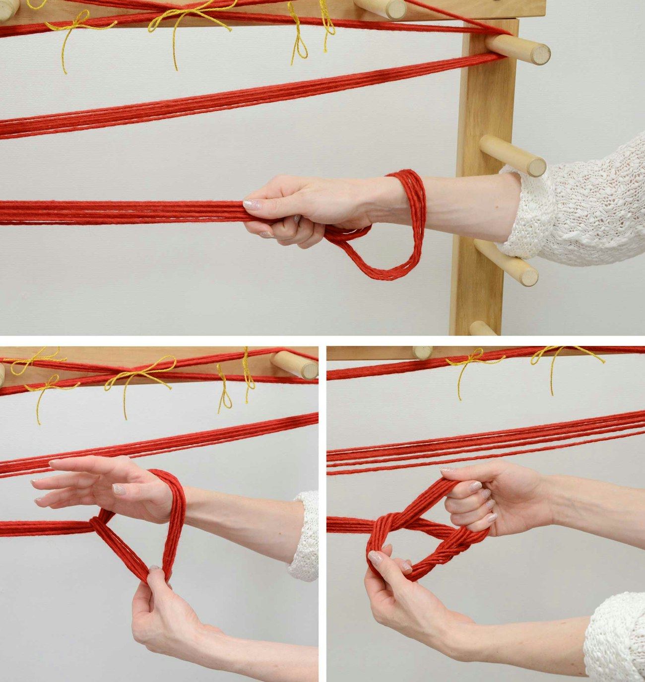 Chaining: To keep your warp organized off the warping board, you’ll want to chain it as you remove it. Starting at the bottom, pull the looped threads off the ending peg while maintaining the open loop. Stick your hand through that loop and grasp the entire group of warp threads that‘s next to your hand. Pull the loop that is resting on your wrist over those threads. You‘re now holding a new loop. Push your hand through this new loop, grasp all the warp threads just beyond it, and pull them through the loop. (See photos above, beginning at the top and moving counterclockwise.) Keep a little tension on the warp as you go, so the threads don’t pop off the next peg.