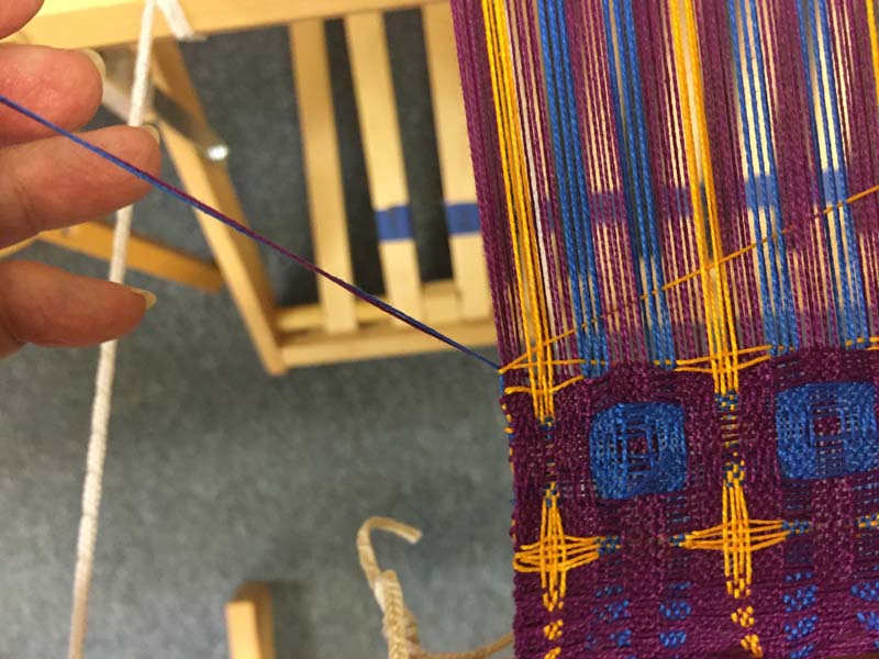 Then, as I weave, I treat the inactive wefts exactly as if they were floating selvedges—for each pick, entering the shuttle over them and exiting under them (see photo above). As I take the shuttle out on the other side, I pull gently on the inactive wefts and the active weft to remove any possible weft loops (see photo below).