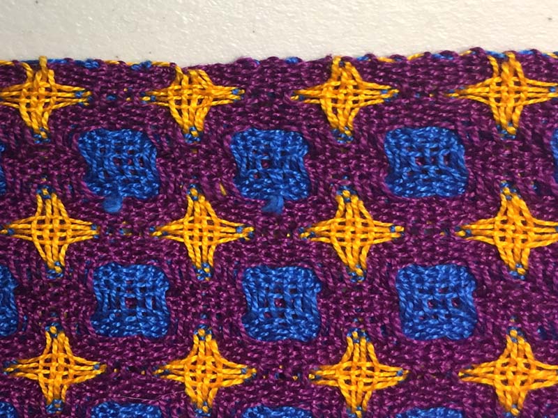 This process might seem time-consuming, but your catching hand will quickly become accustomed to sliding under the inactive wefts. The only added step is pulling on them to firm the edge, but even that will become automatic. And you don’t even have to pay any attention to the order in which you place the shuttles on the stool.
