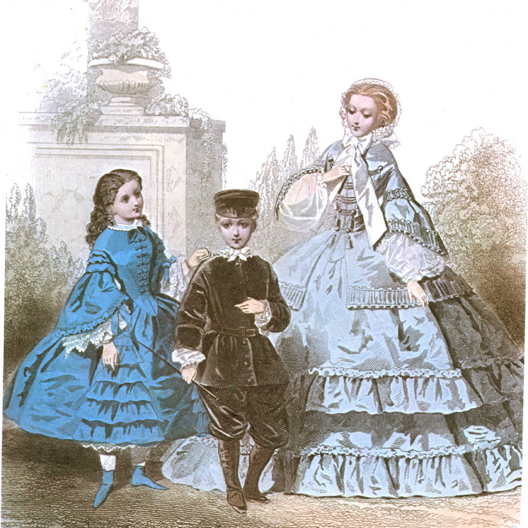 This French fashion plate from 1858 shows a mother and daughter wearing crinolines.