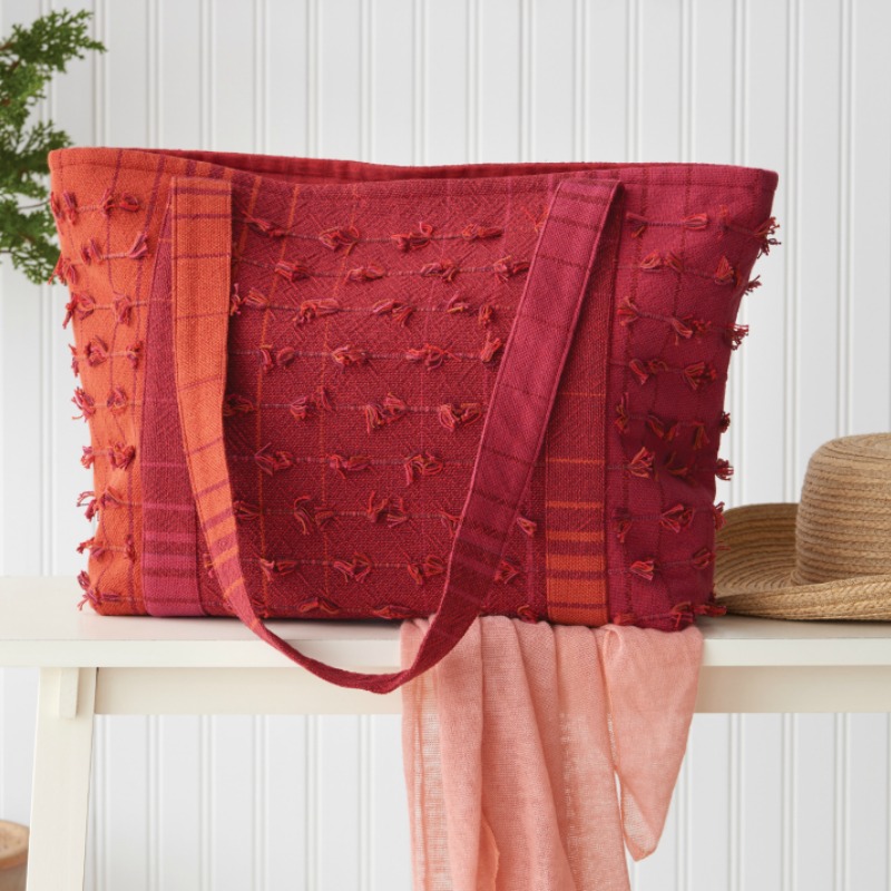 Subtle graduated stripes in orange and red add visual interest to the tote.
