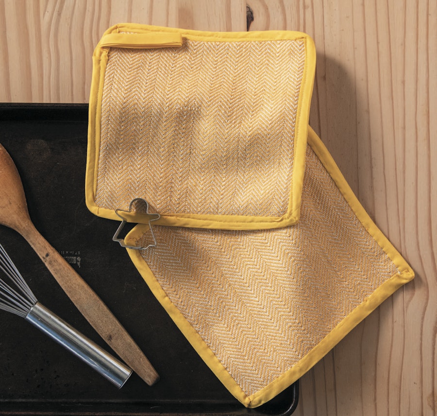 Designer Cathy Wilcox wove a delightful twill apron for Handwoven [November/December 2023]https://shop.longthreadmedia.com/products/handwoven-november-december-2023), and she also wove sets of potholders using the same twill and yarn. A 1991 Handwoven design for thrum pot holders inspired her to double the cloth for heat protection and to use bias tape to bind the edges.