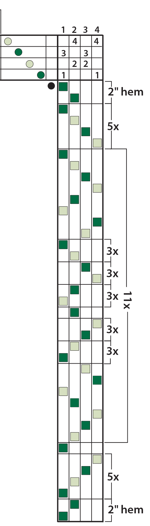 There is an error in the treadling order for Jenny Sennott's In the Pines Runner from January/February 2019. The color order for the 4 picks immediately following the last 3x repeat within the larger 11x repeat bracket should be light green, dark green, light green, dark green. See below.