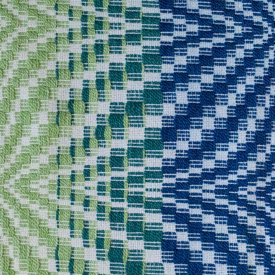 The warp is long enough for two matching or coordinating pillows—the choice is yours! Tegan decided to weave coordinating pillows, swapping the Sapling (light green) with the Dreamscape (dark blue), while leaving the transitioning Ocean Storm (teal) color the same for both.