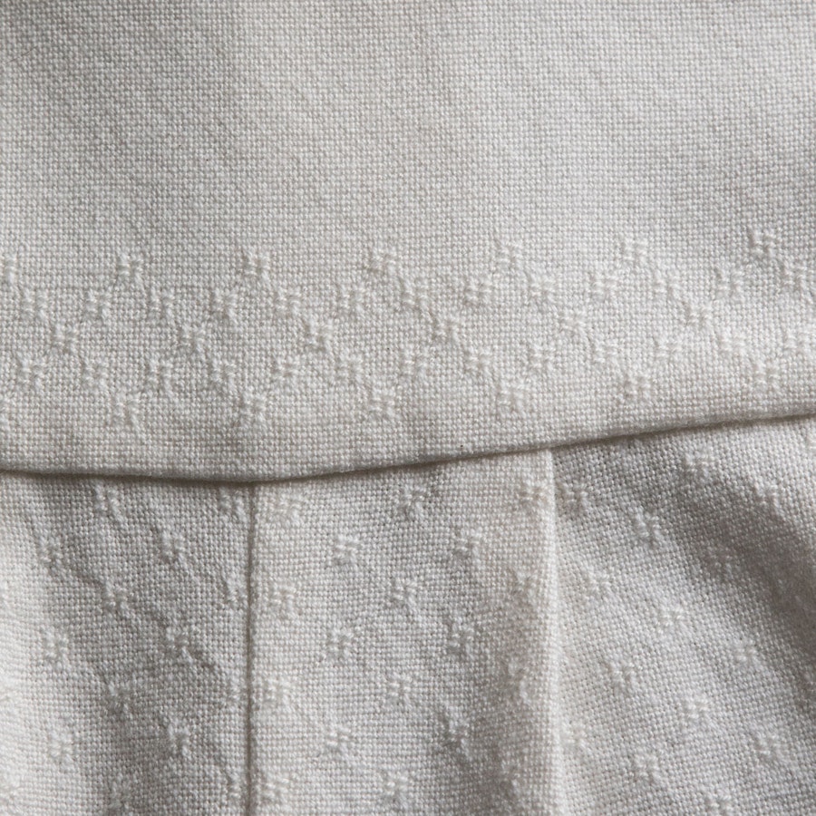 A band of diamonds stretches across the bodice front, while the sleeves and remainder of the outfit have dots of M’s and O’s. Plain-weave cuffs finish things off. Whether you make this piece for a christening, wedding, or other event, it is sure to become a treasured heirloom.