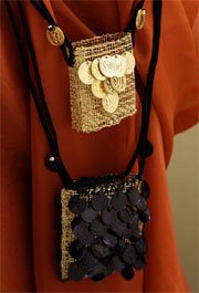 The November 2007 Bag of the Month will make a perfect gift for someone special. A tiny wire-woven gold coin purse doubles as a necklace and a place for tiny treasures. This project is also a great introduction to weaving with gold wire.