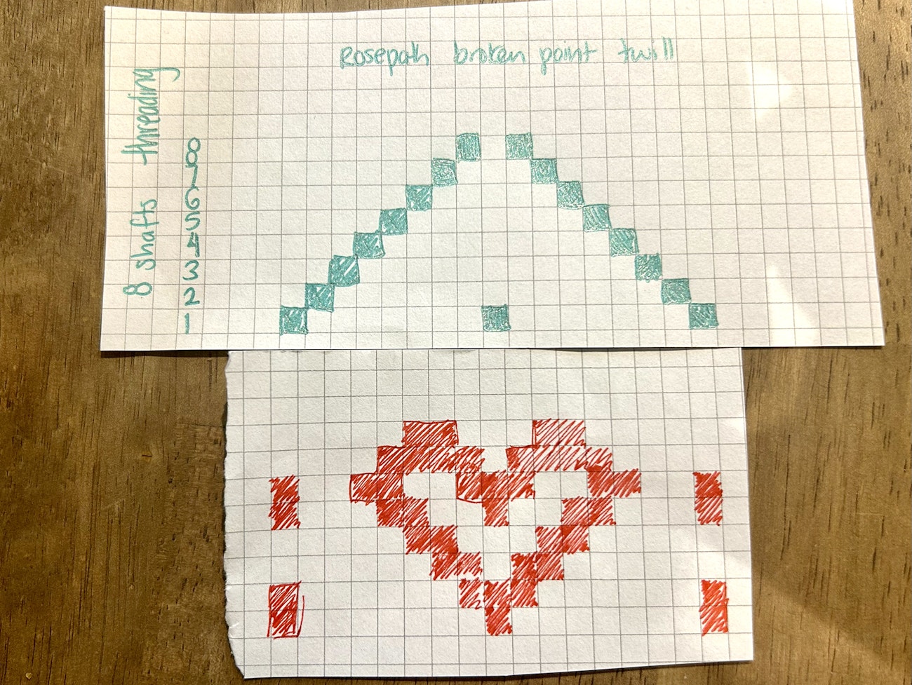 Andrea drew a full rosepath point twill threading for her 8-shaft loom (in green), and then created a heart motif (in red).