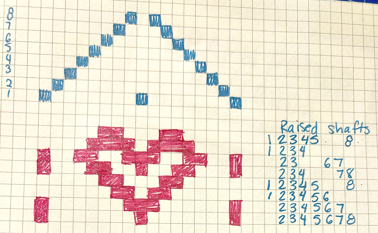 Now the fun starts! Off to the side of the motif, I list every shaft that needs to be raised for each pick (i.e., every square that isn’t colored). As you can see in this heart design, all shafts for red squares stay down during each pick.