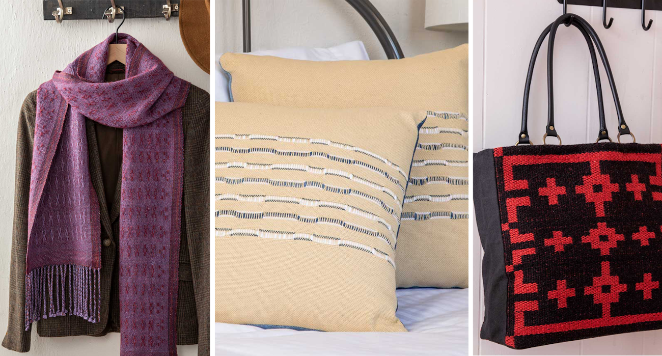 Twill-free handwovens! From left, Robin Monogue's Taste of Sonoma Scarf in barleycorn; Rebecca Fox‘s Dizzy Drones Honeycomb Pillow made using retired jeans; and Annette Swan Schipf‘s Taqueté All Day tote.