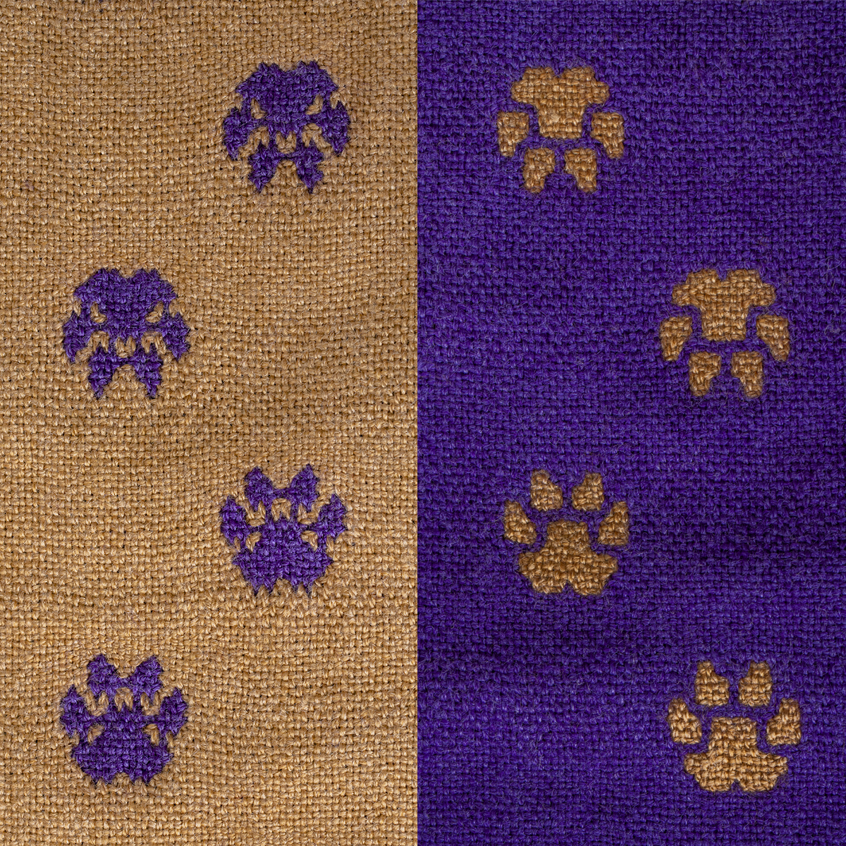Claudia‘s doubleweave scarf includes carefully positioned pawprints that are purple on one side, and gold on the other.