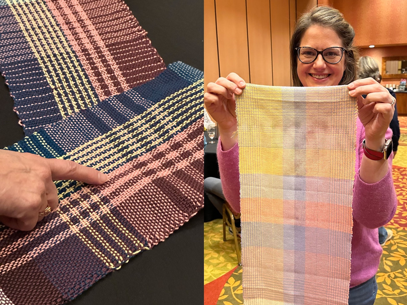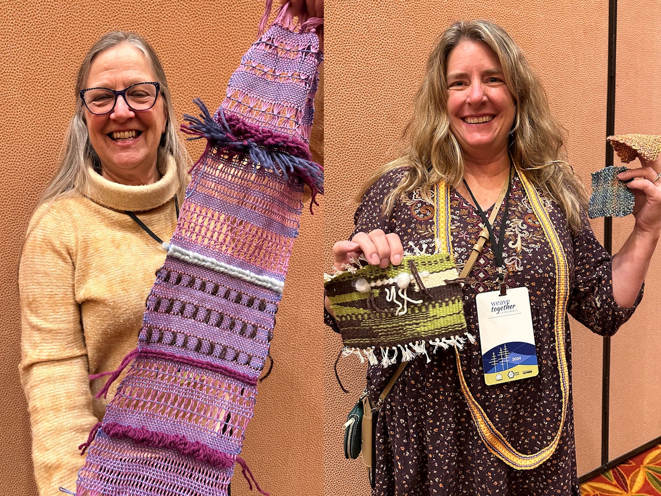 Susan (left) shows off her rigid-heddle shawl/runner, with crammed slots and double wefts randomly added as she wove. Jeannine (right) shows off her Gown-less Evening Strap.