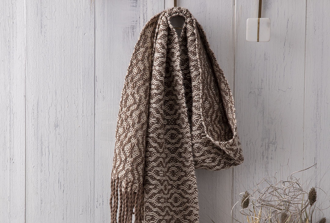 Susanna Day used spot Bronson for her Clouds of Alpaca Scarf in November/December 2021 (above). Off the loom, the slippery alpaca produced wavy lines and spots in unexpected places that weren‘t visible while she was weaving.