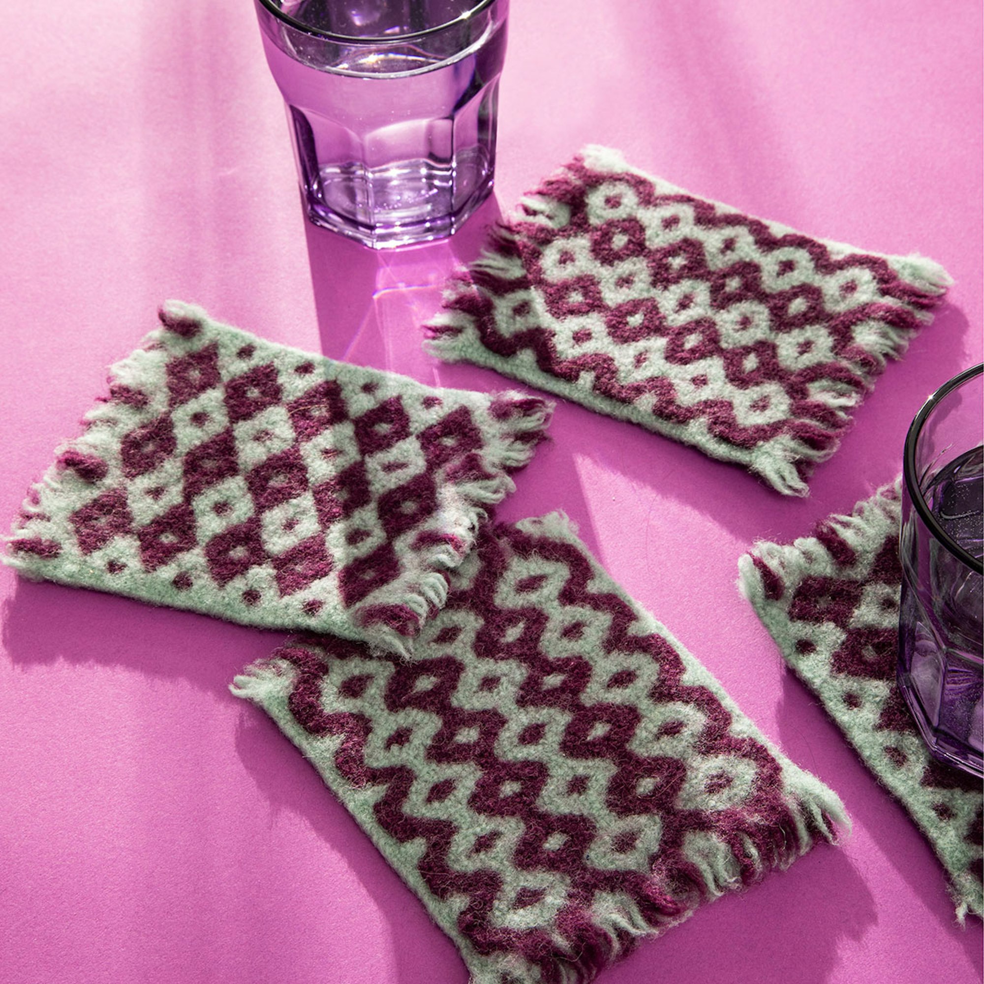 Can you tell how the “doubled“ theme applies to Ellen Kardell‘s Fulled Mug Rugs? Would you be surprised to learn that they‘re also woven in deflected doubleweave? After weaving and fulling, they shrink into the graphic and cushy form you see above.