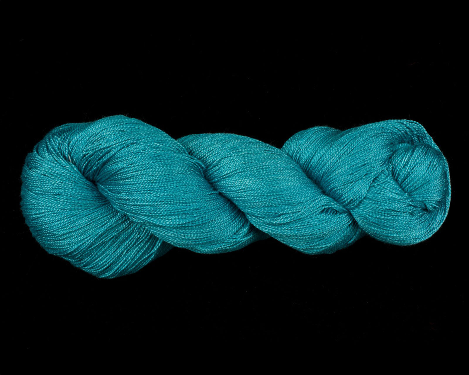 In lovely Azure Blue, Kiku is 100% Bombyx Spun Silk yarn, also called “Cultivated” or “Mulberry” silk. 20/2, lace weight, approximately 1,100 yards/skein. Value $59.95. Learn more.