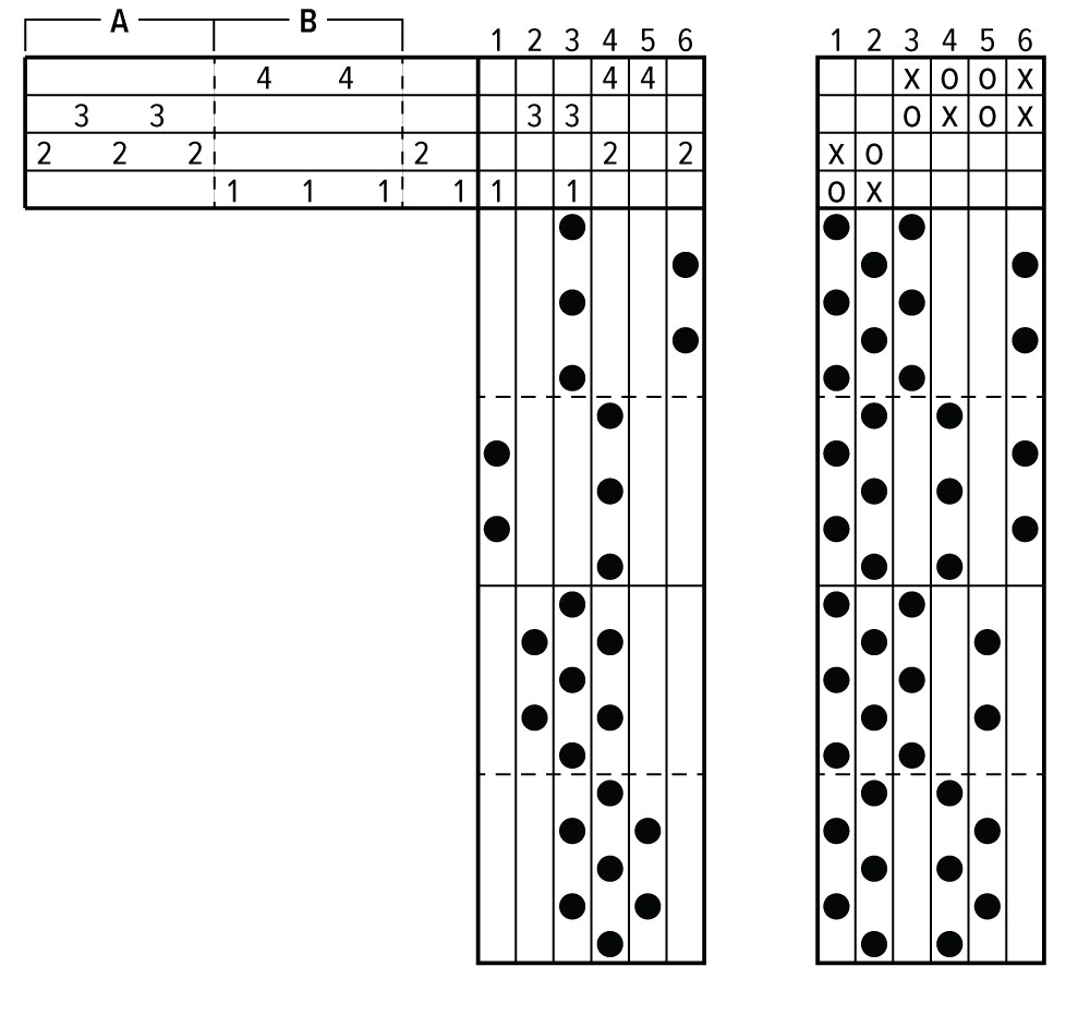 Most skeleton tie-ups can’t be done on a countermarch loom because you can’t ask the same shaft to go both up and down (which happens if you are using two treadles, each tied to all four shafts). It’s one of the disadvantages of a countermarch loom. But skeleton tie-ups can be used on countermarch looms if you remember two rules: every shaft must be moved no matter what treadles you step on (or there will be threads in the center of the shed); and you can’t ask any single shaft to go in two different directions.