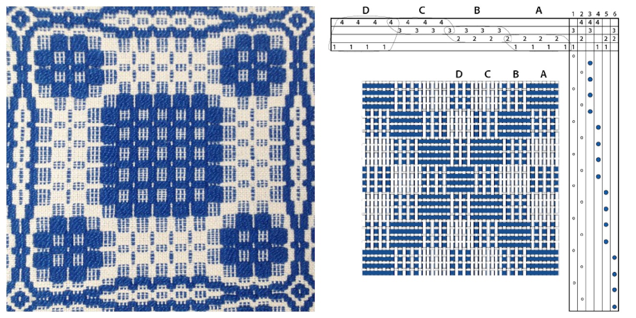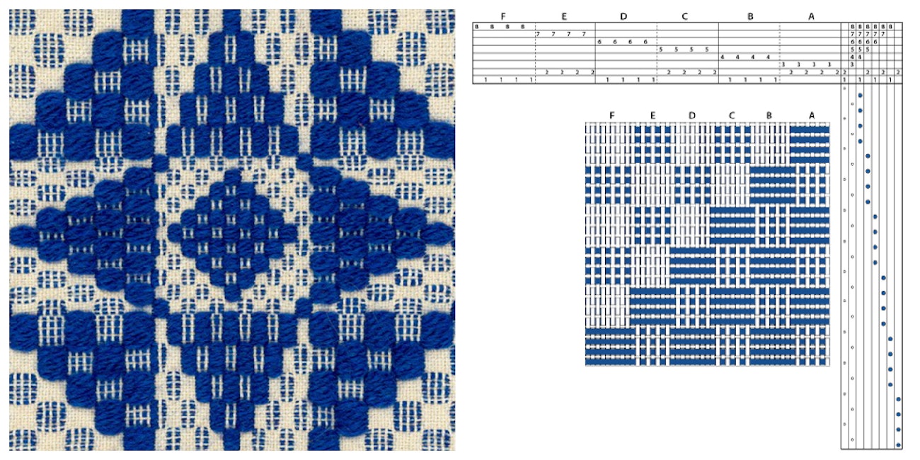 The difference is in the two different threading systems. A thorough structural explanation would take more space than this column provides, but the alternation of shafts 1 and 2 in the half-units of tied overshot leads to blocks being most often threaded and woven in straight or point order, producing its characteristic triangle and diamond shapes. As a result it often called star and diamond weave. Because only two blocks of tied overshot can be woven on four shafts, it’s most often woven on eight or more (each additional shaft provides an additional block), allowing the characteristic star and diamond motifs.