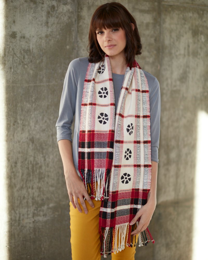 Anita Osterhaug is taken by West African textiles and shows her appreciation in her Homage to Africa Scarf. Anita used traditional colors and a 4-shaft twill to honor African kilims and then applied a simple block-print design inspired by bogolonfini prints. —Susan