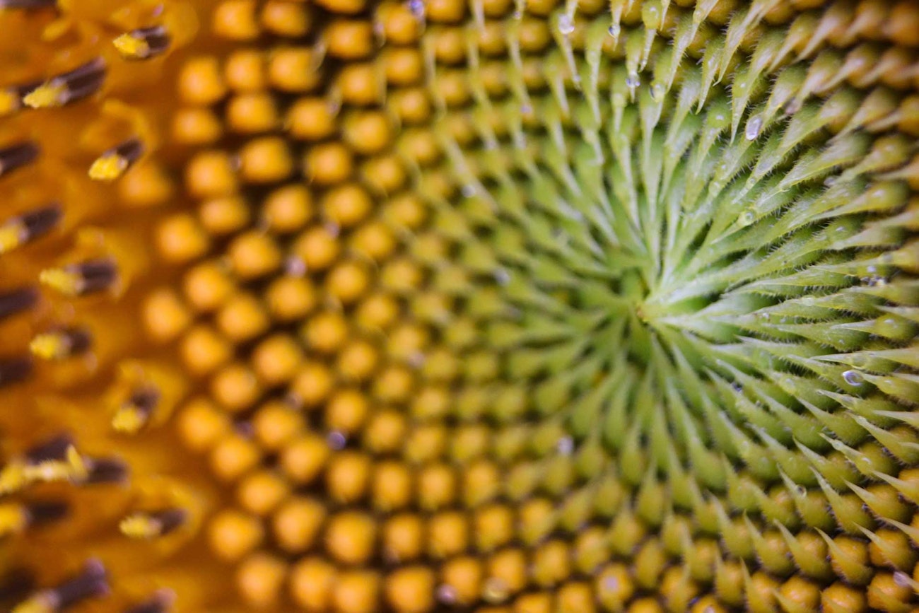 One of the well-known spirals that illustrates the Fibonacci sequence is the seed pattern in a sunflower. Photo by Chris Greninger on Unsplash