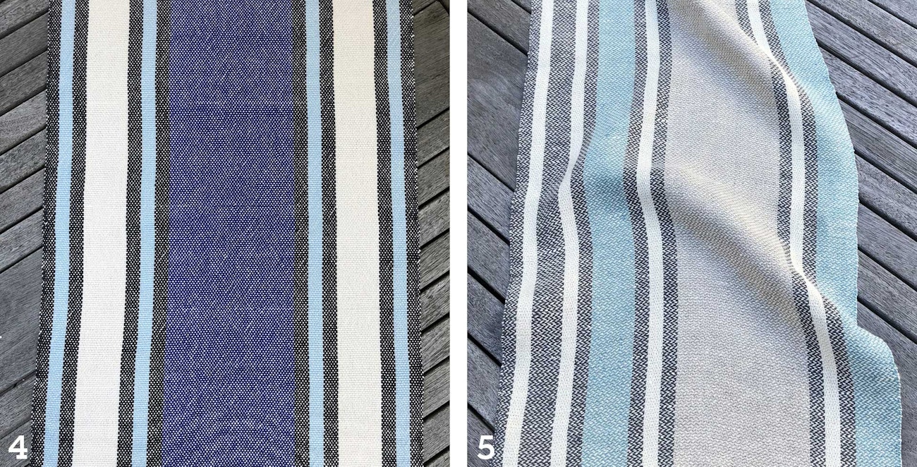 Many designs based on this mathematical sequence are possible! You could start at the bottom with 1s (repeats, inches, sets of 10 ends) and then build up. Alternatively, once you have your stripe sequence, you can move the stripes around, as I did in the towel in Photo 5 when I shifted the three small stripes from the right-hand side to the left, making the design asymmetrical. To my eye, it’s a little unexpected and a lot more interesting.