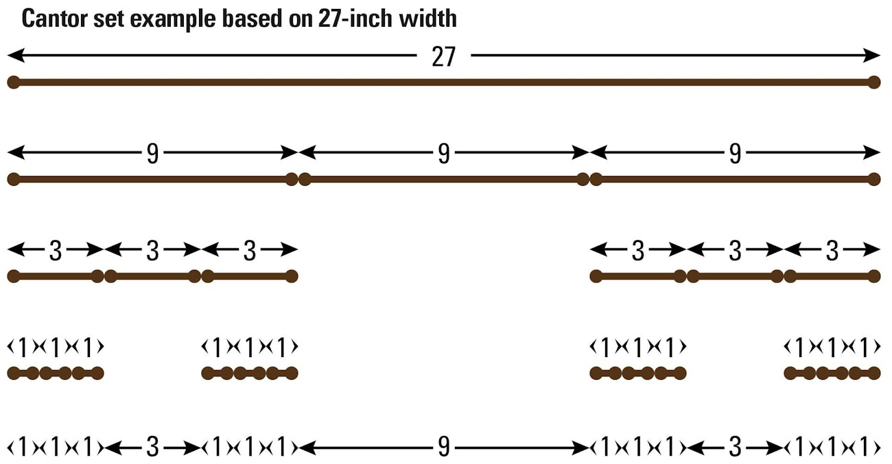 One day, in a not-so-subtle hint that I might consider branching out from Fibonacci, my engineer husband introduced me to the Cantor set. Georg Cantor was a German mathematician in the 1800s who is considered the father of Set Theory. I won’t pretend to know what that means, but in the Cantor set, a segment (let’s say a warp) is divided into 3 equal units (widths). Then, each end unit is divided into thirds, and each of those end units is also divided into thirds (and this goes on to infinity). How might you use a Cantor Set in weaving? Let’s say you have a 27-inch-wide warp (or a warp with 27 repeats across) but aren’t sure how to sequence the colors. Applying the Cantor set would give you the design below.