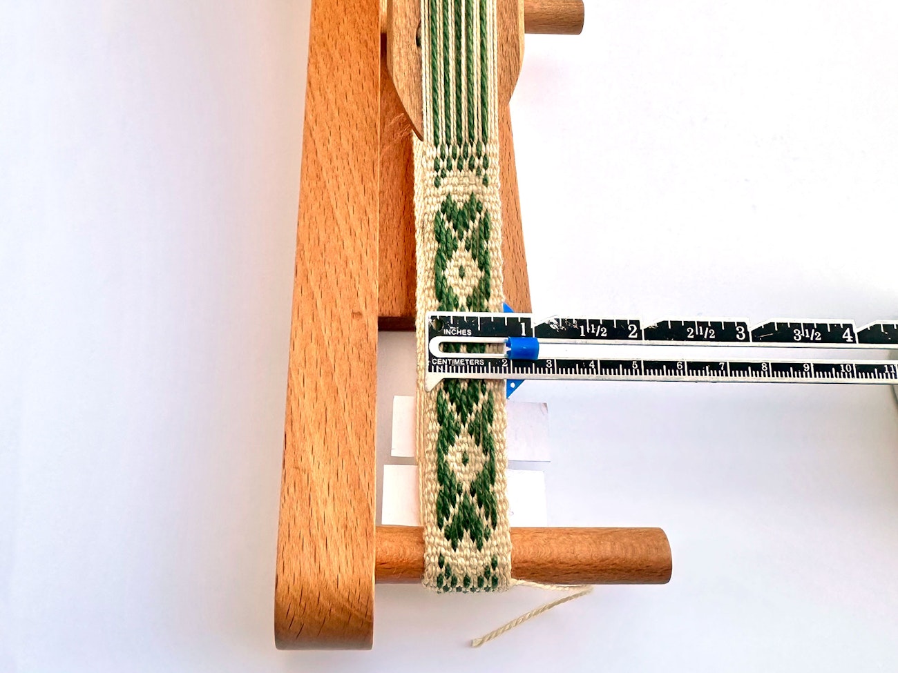 A sewing gauge or small ruler is handy for every inkle weaver. Once you have a band‘s width set, use the ruler to measure it often so you can keep the width consistent throughout.