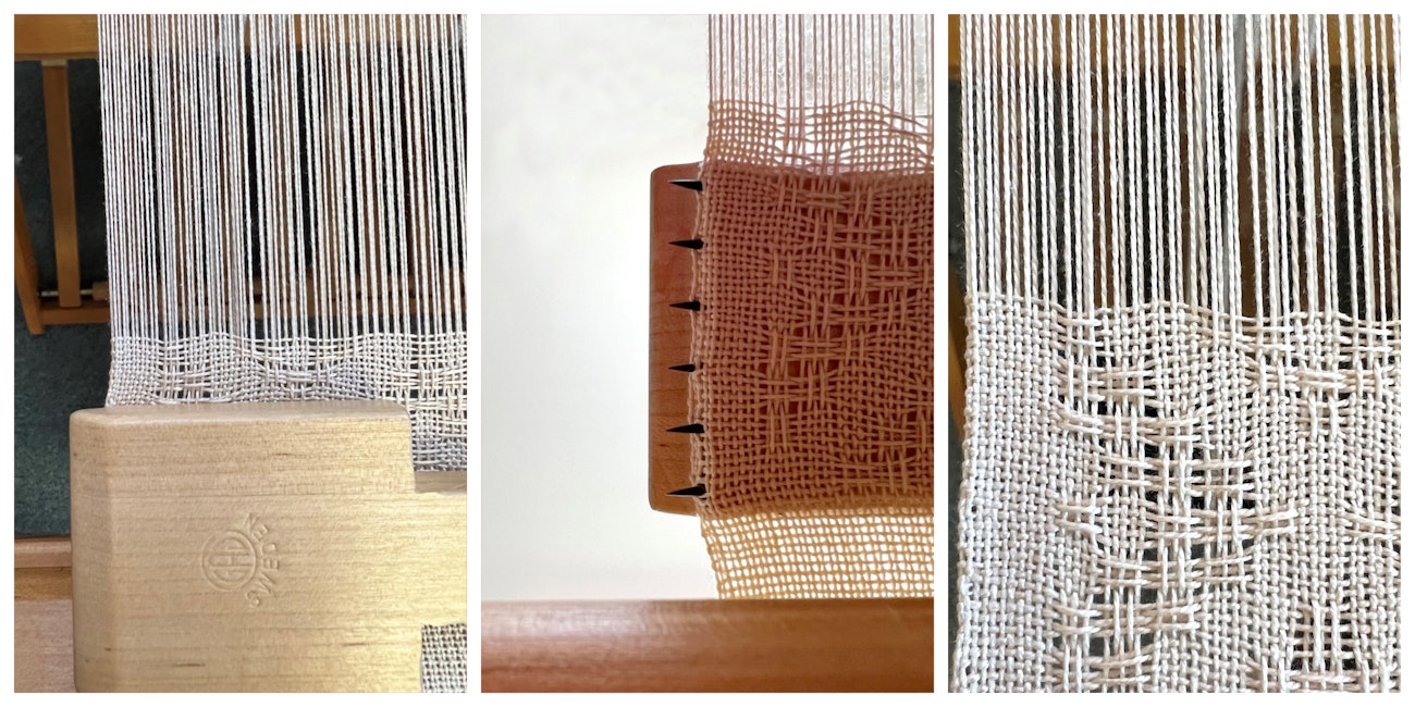 Placing the teeth close to the edge is really important. If they are inserted inside the edge, they will push warp ends apart where they are inserted, and the gap is likely to remain in the finished cloth as shown in photo b above. The temple will not leave any spaces or holes if it’s placed close to the edge and if the weft turns firmly against the outside thread (see Photos c–e below).