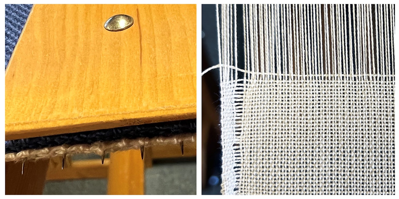 I love your reference to the “stabby” ends of the temple—most of us have been stabbed by them at least once! The answer to your question is: Yes, you need to place the teeth in both layers. Photo a below, left, doesn’t quite show the teeth going through the top (blue) layer of the doubleweave fabric, but they do. You have to place the teeth carefully in the top layer first, then in the bottom layer, as close to the outside warp end in each layer as possible (the teeth have to be inserted practically at a right angle to the cloth edge to do this).