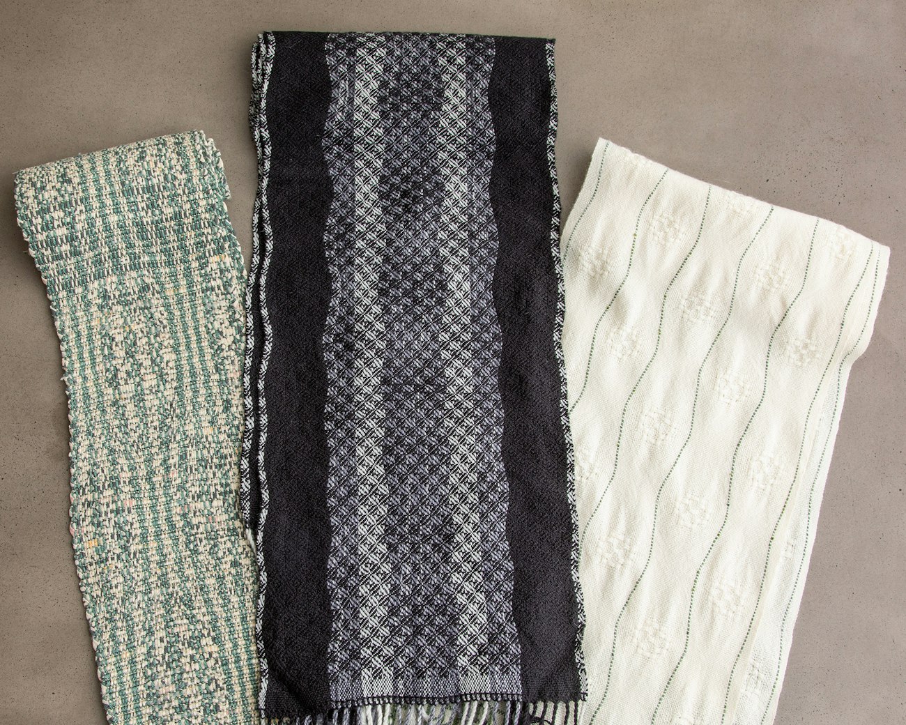 Three ondulé scarves. Note the sakiori-style scarf on the left woven in solid and variegated Tencel, and silk fabric remnants. Warp sett changes created warpwise stripes in the fabric.