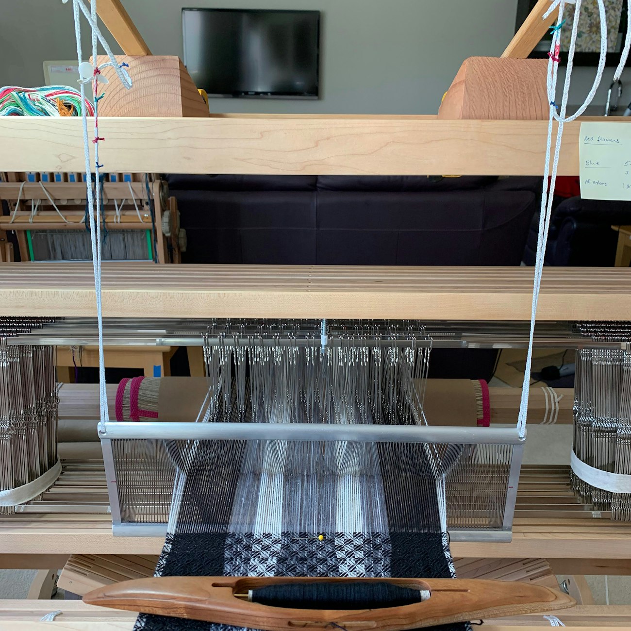 Anu’s black-and-white scarf on the loom threaded through the fan reed and midway through weaving.