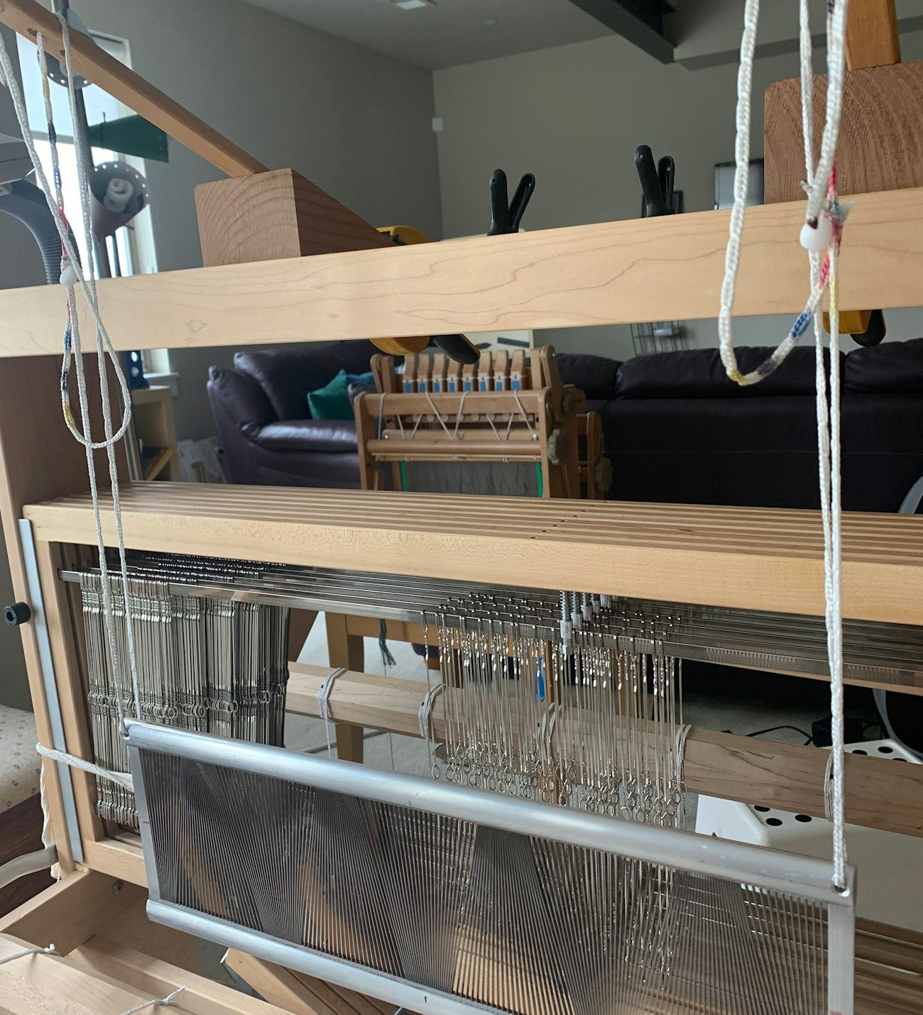 I am a front-to-back warper, and according to The Woolgatherers, you must warp back to front with a fan reed to avoid damaging the dents. To resolve this issue, I first warped front to back with a regular 12-dent reed keeping the lease sticks attached. After beaming my warp, I removed the regular reed, using the lease sticks to keep my ends in order. Then I re-sleyed my warp in the fan reed before tying the warp to the breast beam. After switching the reeds, I pushed the beater out of the out of the way leaving it to rest against the breast beam and the now threaded fan reed hung in place in front of the heddles. It worked like a charm!