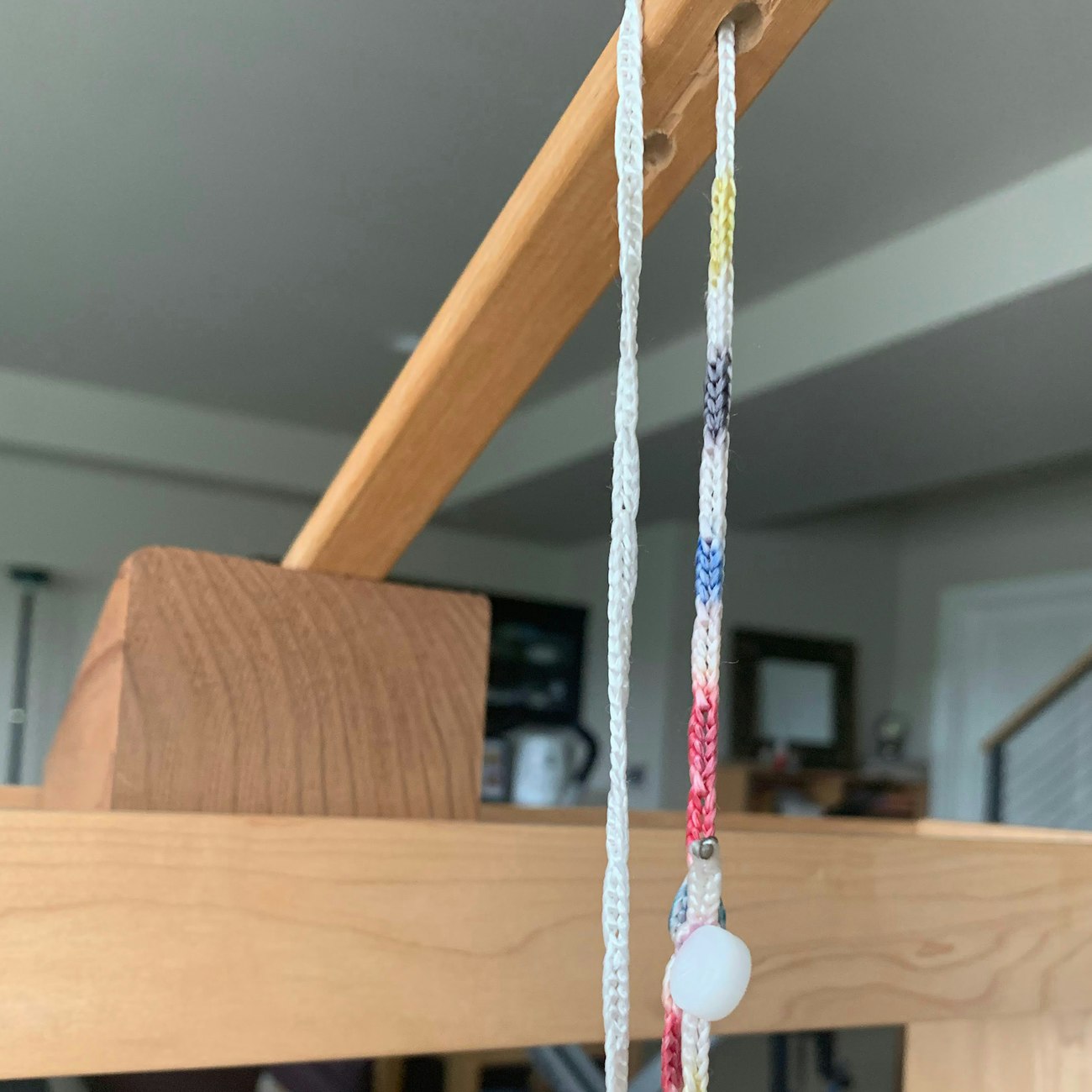 Marking positions on the Texsolv cord allowed Anu to see where to move her pegs as she wove.