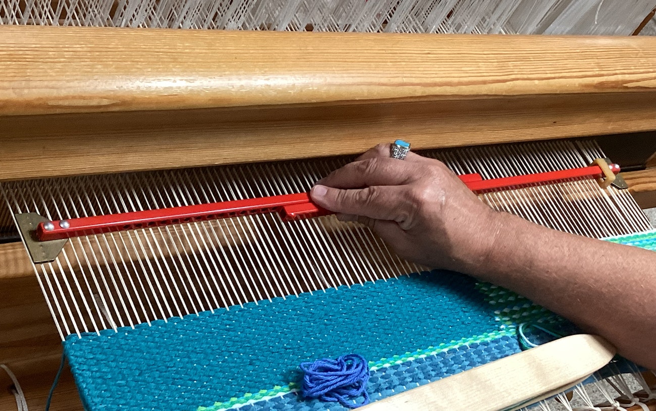 They were correct. With time and practice, my edges improved—but I still had the occasional broken warp end, and it always seemed to be at the selvedge. I noticed that if I brought the shafts to a neutral position and moved the beater gently up against the fell, the reed struck the fell line perfectly in the middle of the piece, but it was bending and stretching the warp threads at the edges. This rubbing of the reed’s teeth caused them to fray and eventually break.