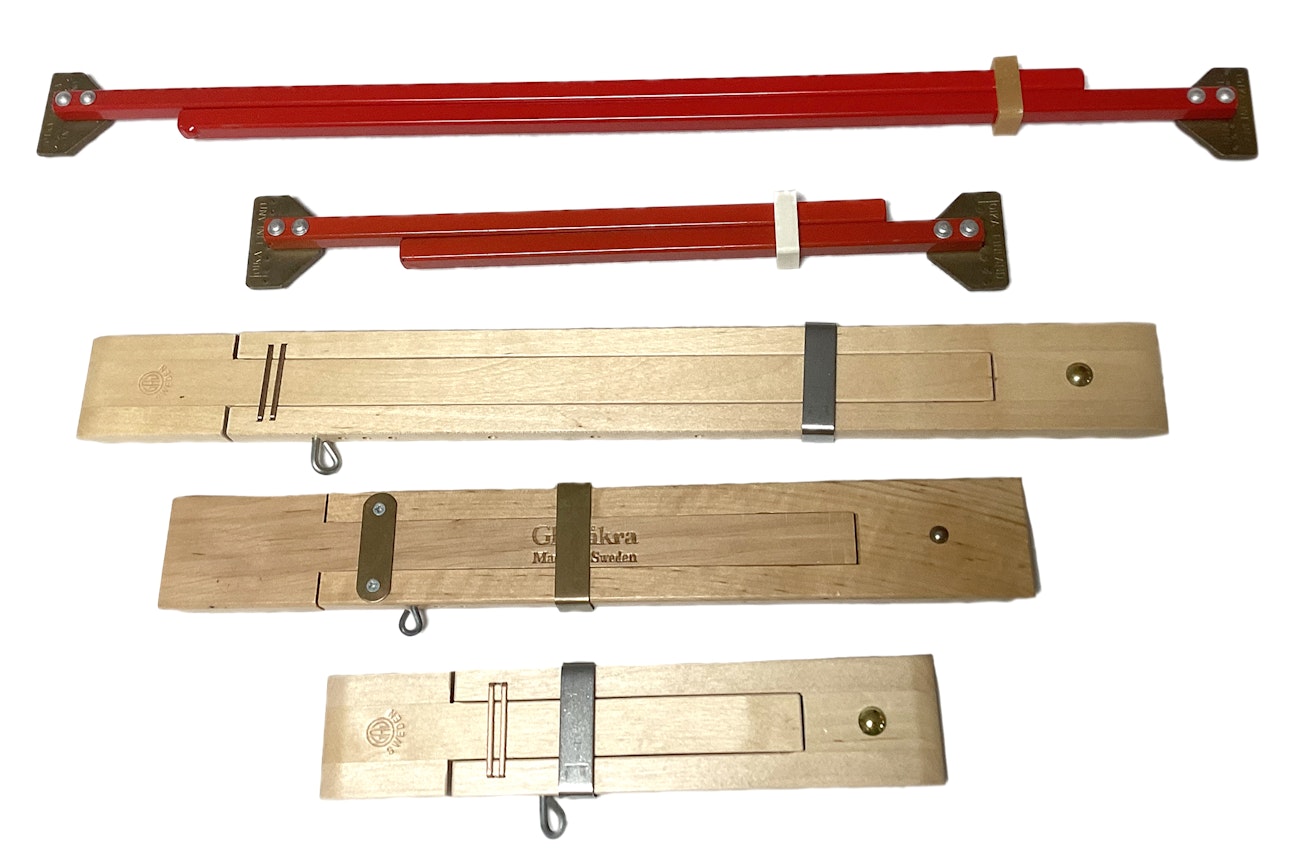 Traditional temples can be made of metal (top examples) or wood (at the bottom). They are sized for specific weaving widths.