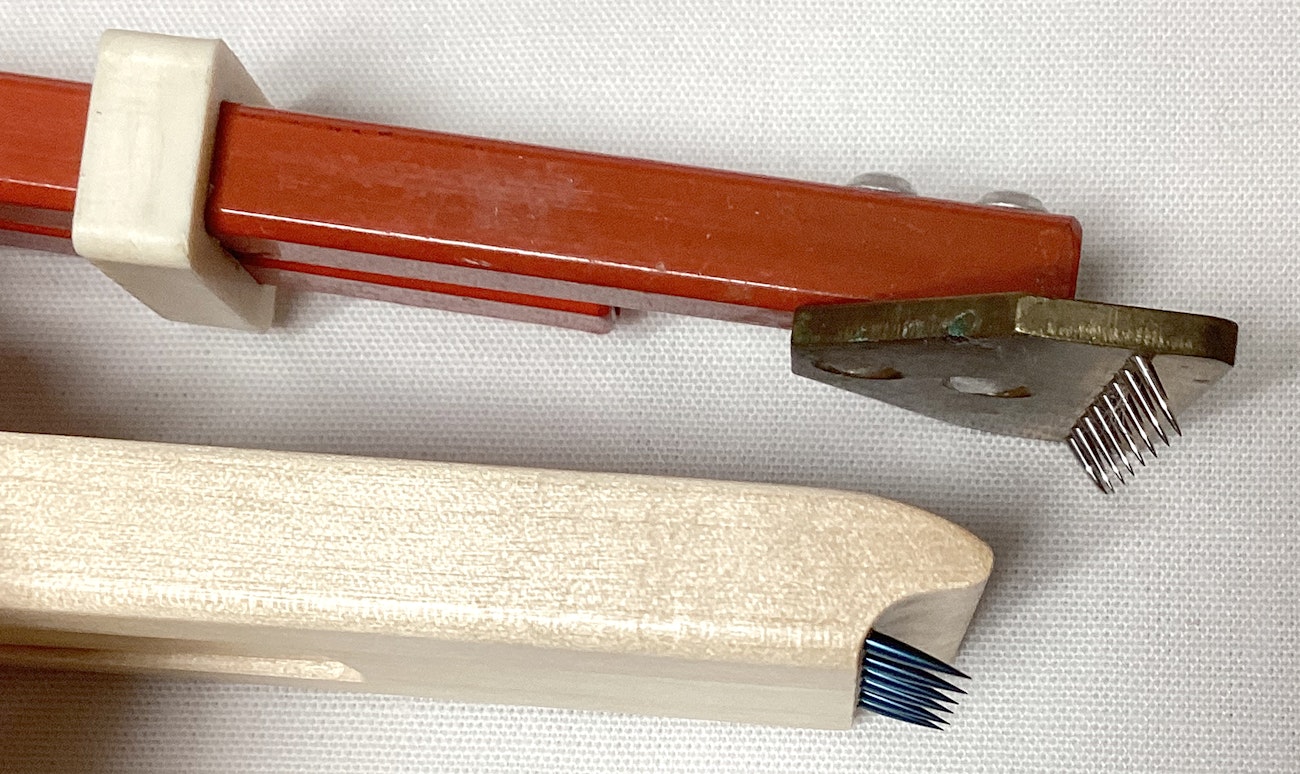 The wooden temple has teeth that are set at a shallow angle extending from the frame of the temple. These temples work best on thinner fabrics. The metal temple‘s teeth are on a more acute angle, so they bury themselves better into the thickly woven selvedge edge.