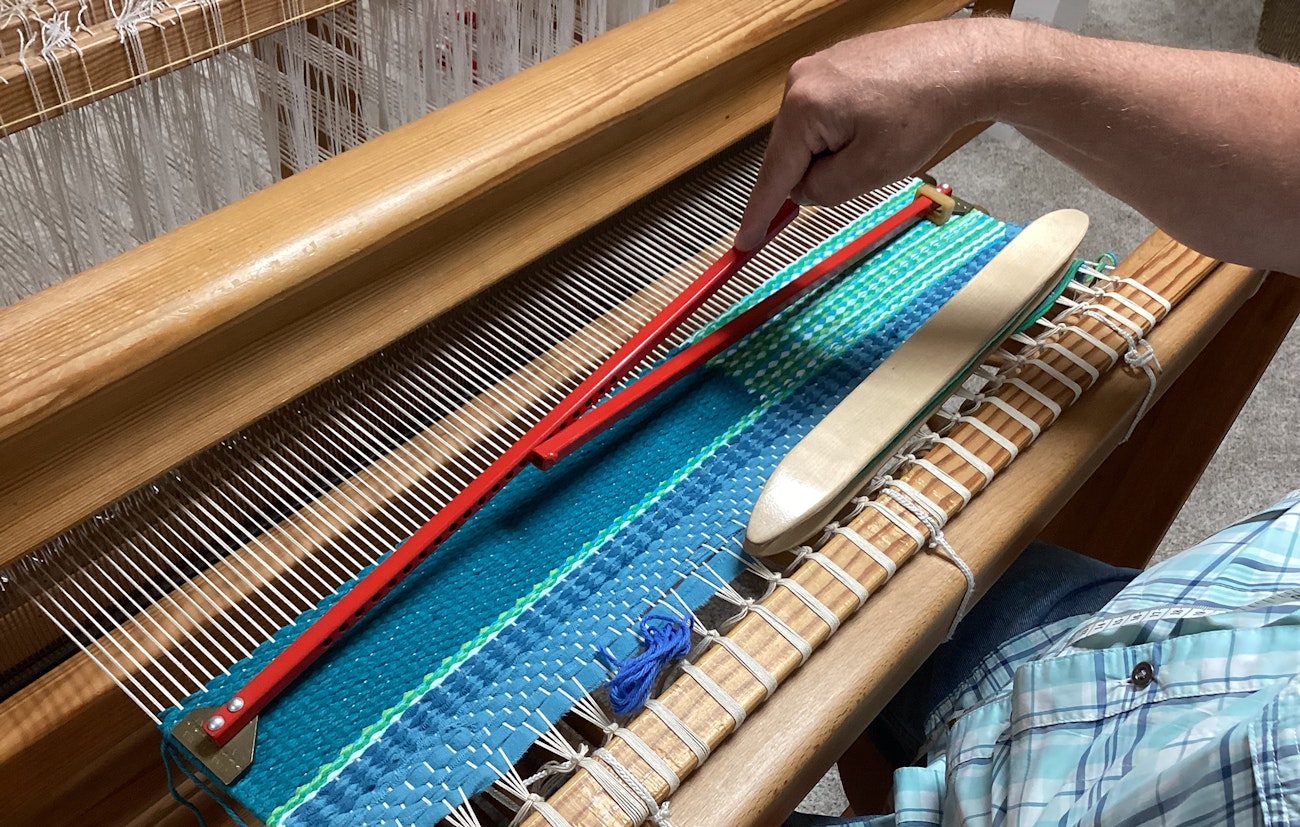 Temples are also known as stretchers, which is a good name for them because they stretch the edges of your weaving so it is the same width as the warp in the reed. The most common temples are made of wood or metal. Both have very sharp teeth at each end that catch the woven edges and push them out. Those teeth are not really dangerous, but they do demand respect. They have pricked my fingers a time or two when I wasn‘t paying attention to what I was doing.