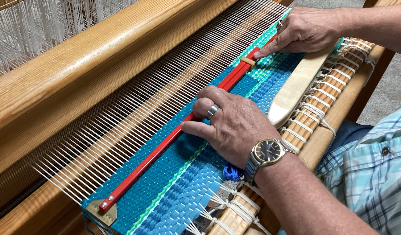 I then had the opportunity to take a rug-weaving class with the late, great Peter Collingwood. Peter insisted that we use a metal temple while weaving our samples, and he showed us how to adjust it. Within a few minutes of weaving with it, I understood how it prevented unwanted draw-in. And when I brought the beater forward and rested the reed against the fell line, I could see that the reed struck the fell line evenly and did not stretch the selvedge warp threads.
