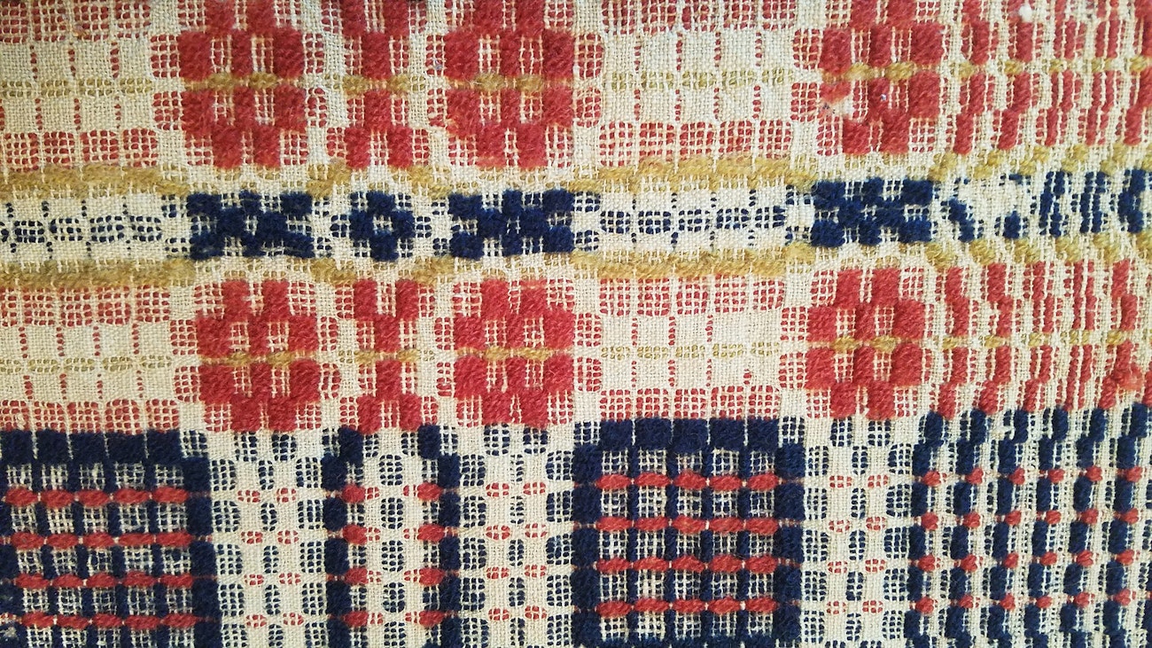 The final two elements, color and pattern, come easily for most people— myself included. Combining colors in an overshot pattern is like magic to my eye. It is easy to weave my favorite color into a neutral-colored warp, and I will sometimes add a second or third color and weave them in specific areas of the treadling to add interest to the design. I learned many of these tricks from looking at and studying the woven coverlets of weavers long ago.