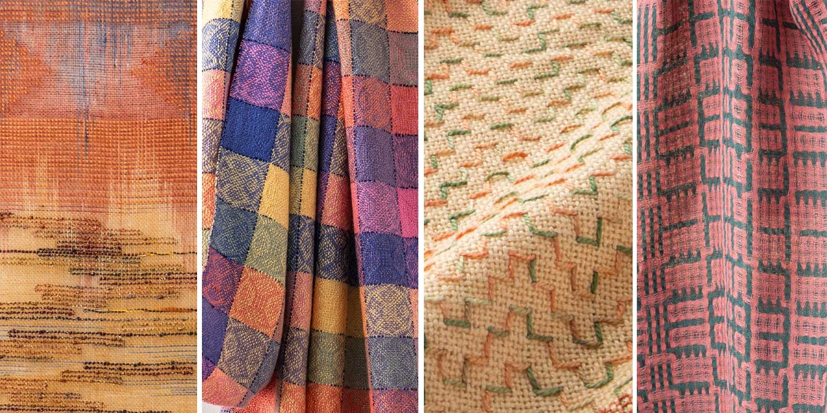 From left, Rebecca Smith's Sunset Reflections wall hanging; Eileen Lee‘s Mosaic Tiles Scarf; Mary McConnell‘s Sashiko Trails Table Linens; and Kate Lange-McKibben‘s City Circuits Scarf.