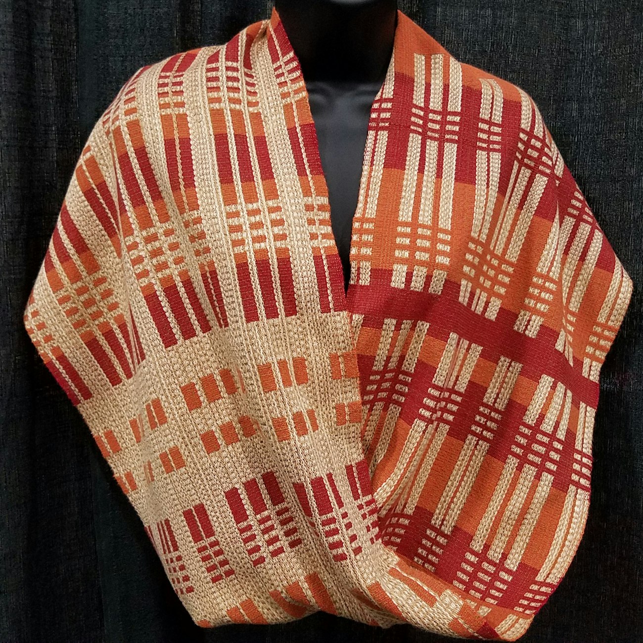 Karen wove Red Mobius in turned beiderwand using hand-dyed Tencel, rayon, and bamboo. Photo courtesy Karen Donde