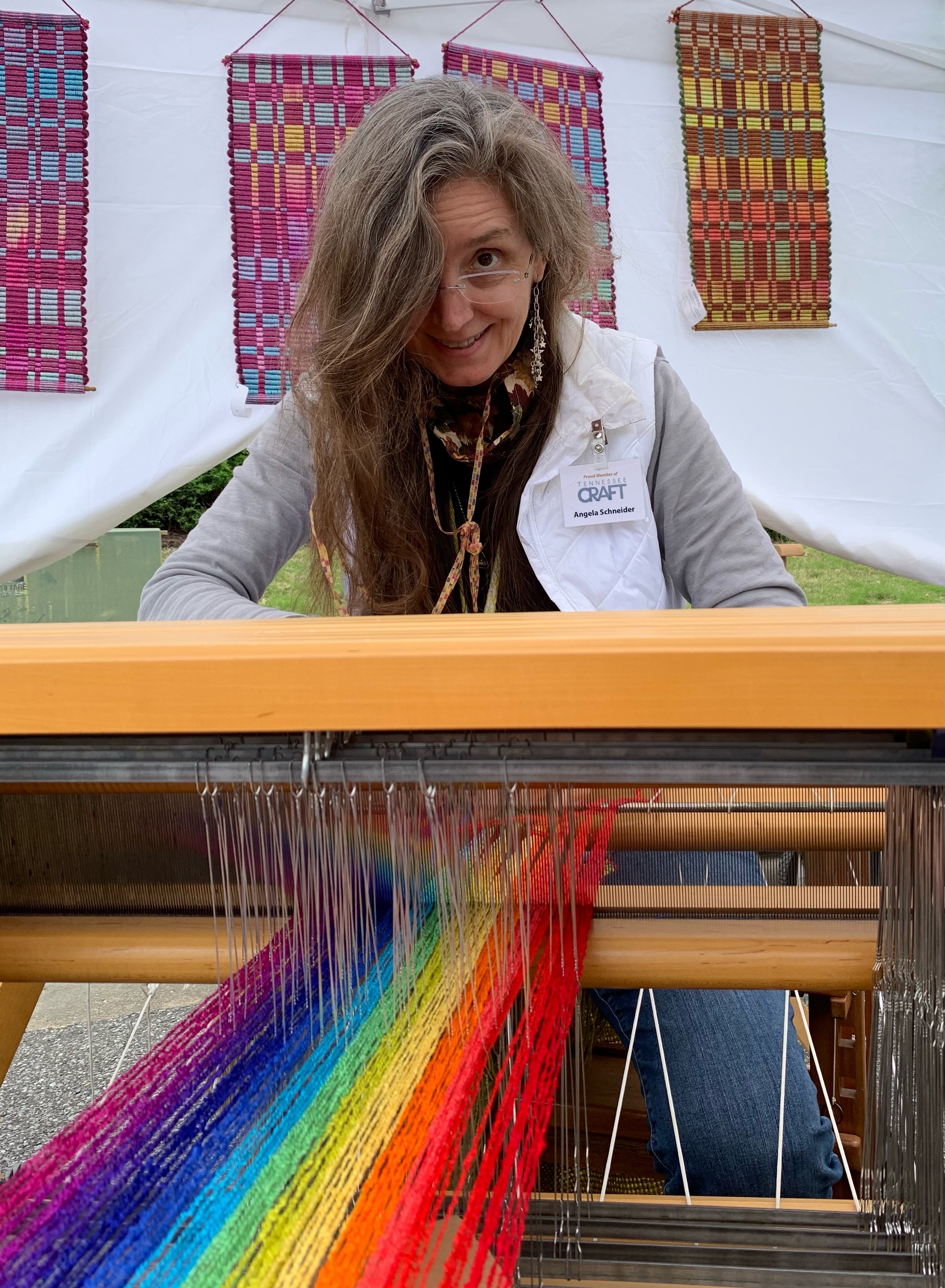 I teach beginner classes in multishaft, inkle, tablet, and rigid-heddle weaving. For my “Weave a Scarf in a Day“ class, students can arrive in the morning with no knowledge, and walk out at the end of the day with a scarf they’ve woven from scratch. For more advanced students, I teach name drafting, double-faced tablet weaving, and the design possibilities of deflected doubleweave.