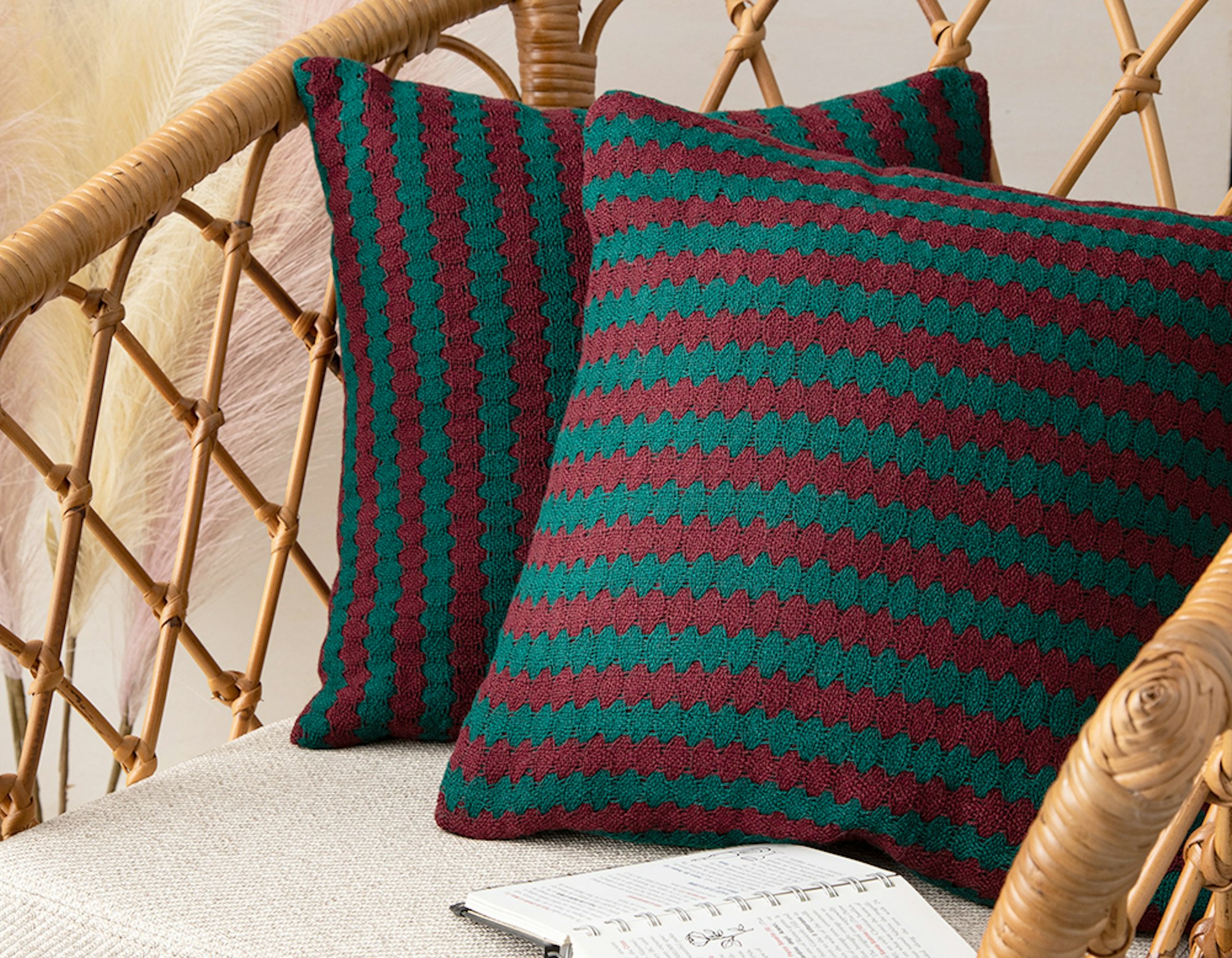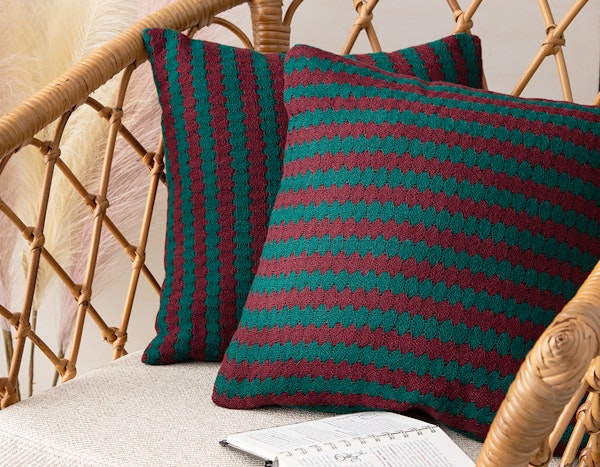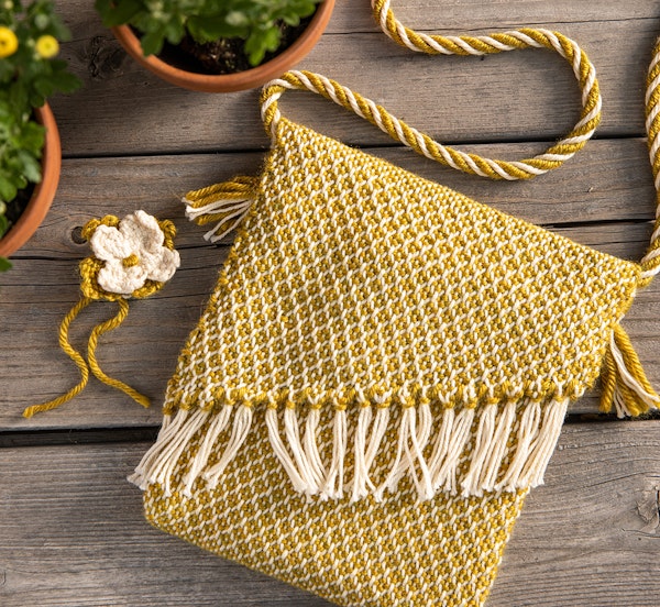 Left: Angela‘s Sawtooth Stripe pillow design in deflected doubleweave, from the November/December 2021 issue of Handwoven. Right: Her textured Garden Party Purse for the rigid-heddle loom, from the Spring 2023 issue of Easy Weaving with Little Looms. Photos by Matt Graves