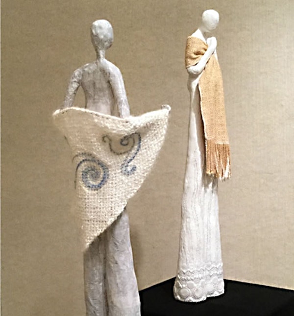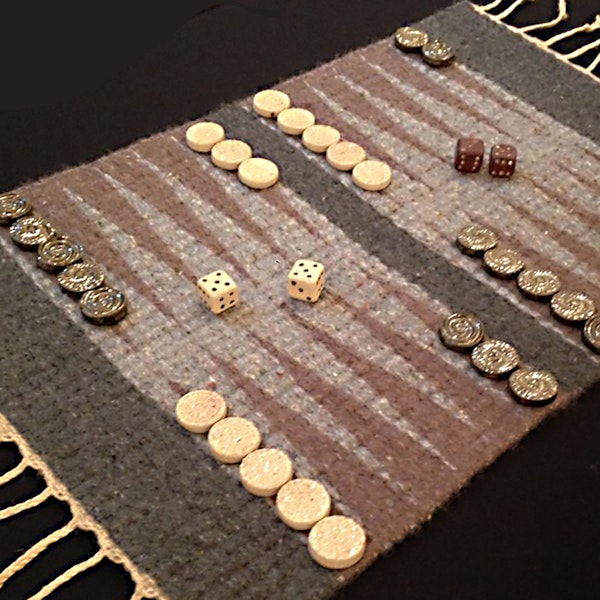 A few examples of Angela‘s collaborative work with other artists. From left: kuminimo braids in a copper sculpture by Lisa Ritenour; a backgammon board in modified 3-end block weave with shaft-switching, in collaboration with potter Rose Conway; and “Fill Your Sails” and “Steadfast,” in collaboration with sculptor Heidi Walter.