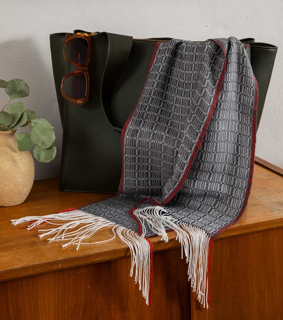 The sheen of Tencel, the overall pattern grid in shades of gray, and the white fringe give this scarf a sophisticated look. Other color combinations would be equally lovely—such as a red-wine weft on a periwinkle warp, or a birch weft on a navy warp.